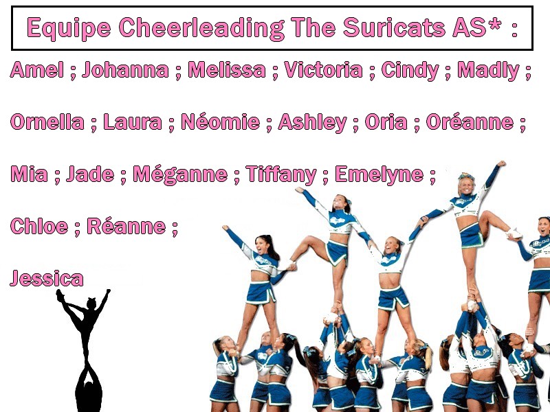 Cheer Séléctioné : Eva P ; Julia S ; Mareva C ; Manon J ; Tiffany K ; Alison K ; Réanne G ; Mélanie K ; Méganne O ; Laura R ; Oria H ; Emelyne N ; Jade U ; Joyce M ; Néomie D ; Cindy P ; Jessica H ; Chloe J ; Cleya O ; Miléne H ; Mina S ; Oréane G ; Candy F ; Gaelle G ; Léa A ; Noémie L ; Estelle P ; Cassandra F ; Ashley Y ; Mélissa W.