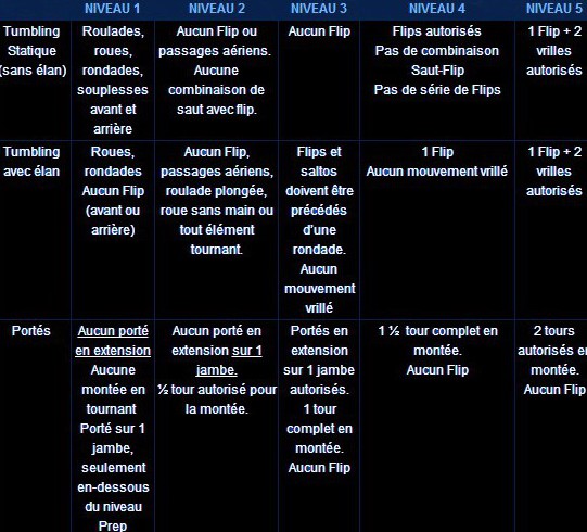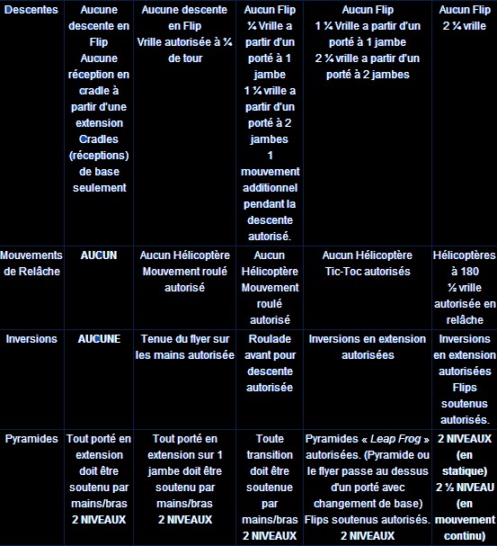 La réglementation appliquée pour la détermination de ces niveaux est celle de l'IASF (International All Star Federation)