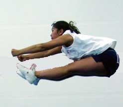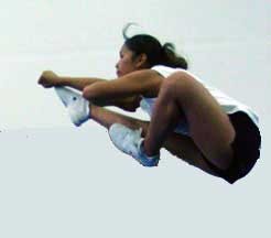 monter les jambes vers la poitrine, mettre les bras en V-haut, pour donner un aspect étiré au saut. On peut décider de lever les jambes un peu sur le côté, pour faire une sorte de courbe. Sur la photo, on a ce qu'on appelle un spirit tuck; monter les genoux vers la poitrine, et garder les genoux joints.